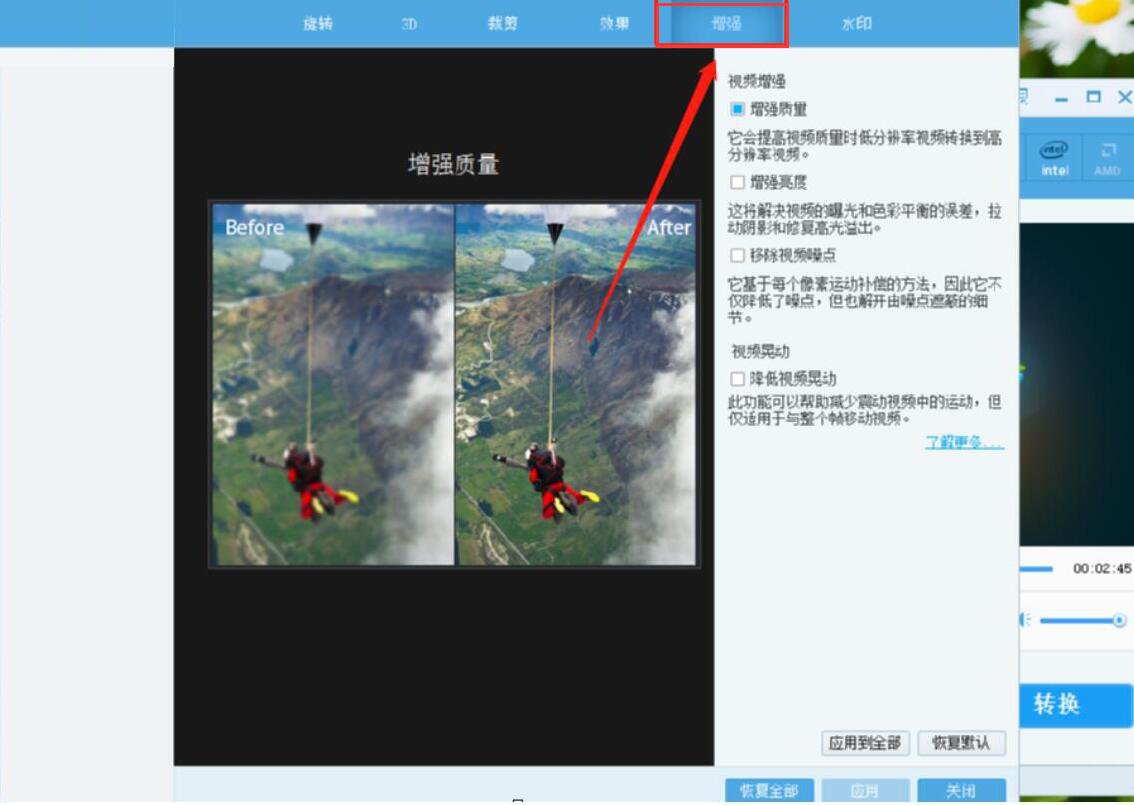 4、接下来,在视频编辑界面中切换至“增强”选项,我们可以看到视频增强有几个选项可以选,例如增强质量、增强亮度、移除视频噪点、降低视频晃动。