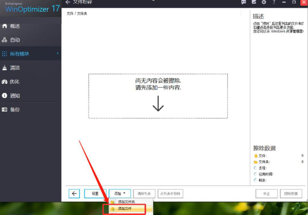 2、进入Ashampoo WinOptimizer的文件粉碎操作界面,点击界面下方的“添加”按钮,并从其选项中再点击“添加文件”选项。