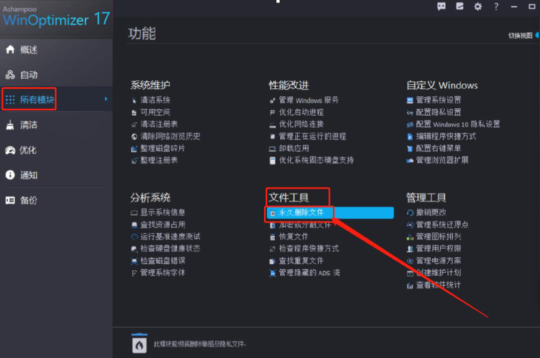 1、首先,我们打开Ashampoo WinOptimizer。在界面左侧菜单栏中点击“所有模块”,并在右侧对应的功能列表中点击“永久删除文件”选项。