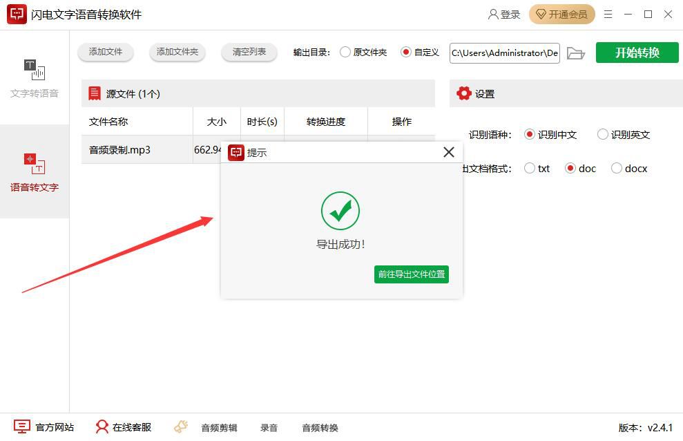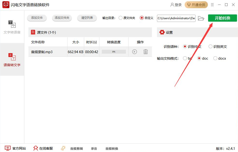 7、语音转文字的语种、格式、路径都设置好了,我们点击界面右上方的“开始转换”按钮,闪电文字语音转换软件便开始将语音转文字。