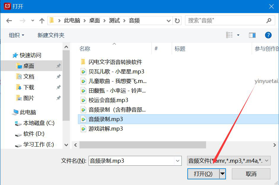 2、在弹出的窗口中,将需要转文字的语音文件选中,并点击“打开”按钮,将其导入闪电文字语音转换软件。
