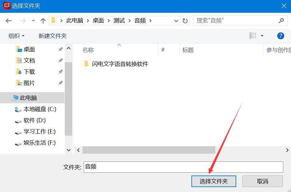 6、接下来,在弹出的窗口中,选择语音转文字后的保存路径,并点击“选择文件夹”按钮。