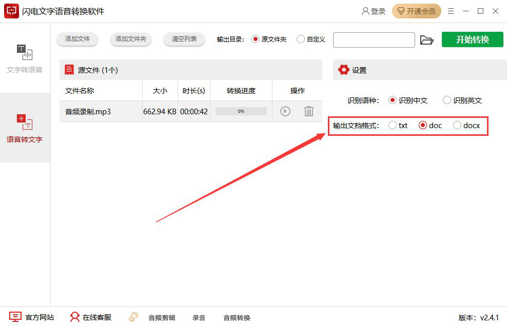 4、语种设置好了后,我们继续选择语音转文字后的文档输出格式,它默认是txt,我们也可以选择doc或者docx。这里为了方便存档需要,我们选择输出为doc格式。
