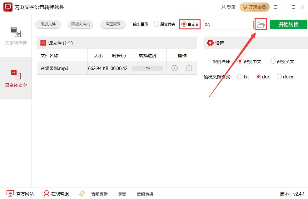 5、如果语音转文字的输出路径要更改,就点选“自定义”方式,并点击如下图的“浏览”文件夹按钮。