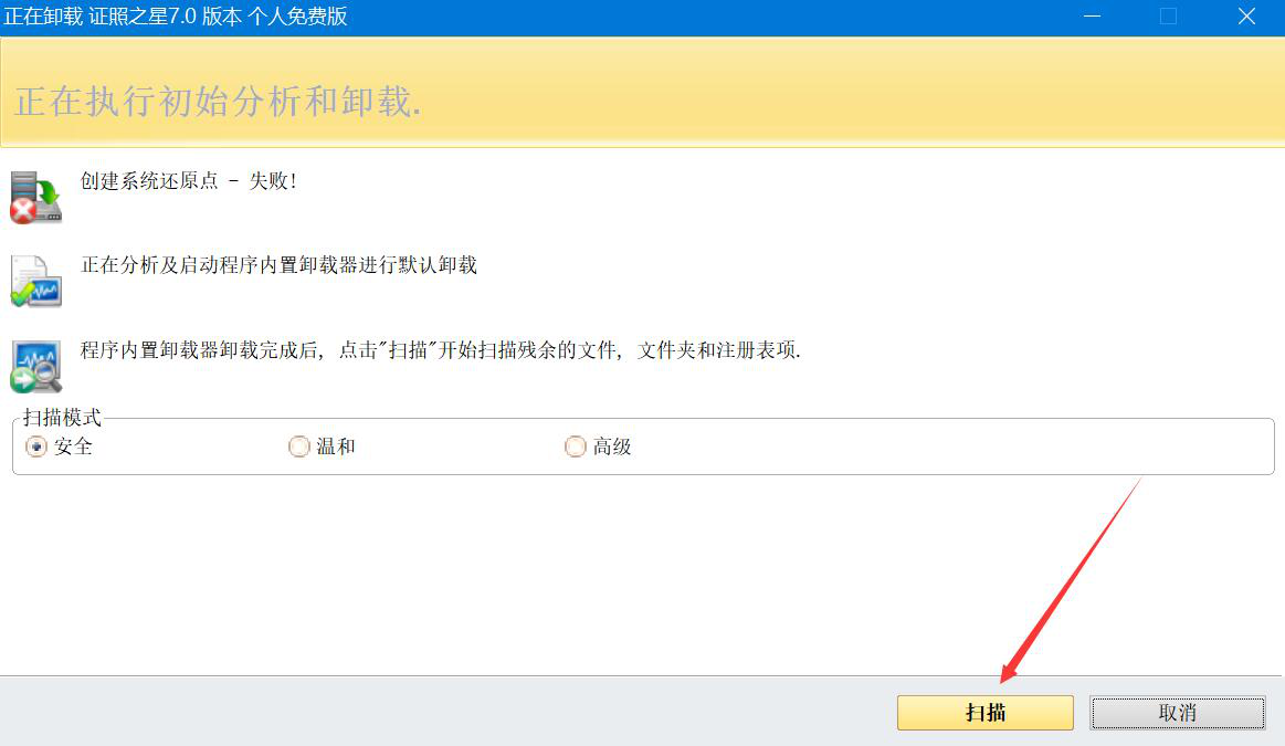 5、接下来,我们点击正在卸载窗口中的“扫描”按钮,Revo Uninstaller便会扫描刚才强力卸载的软件所残余的文件、文件夹和注册表项。