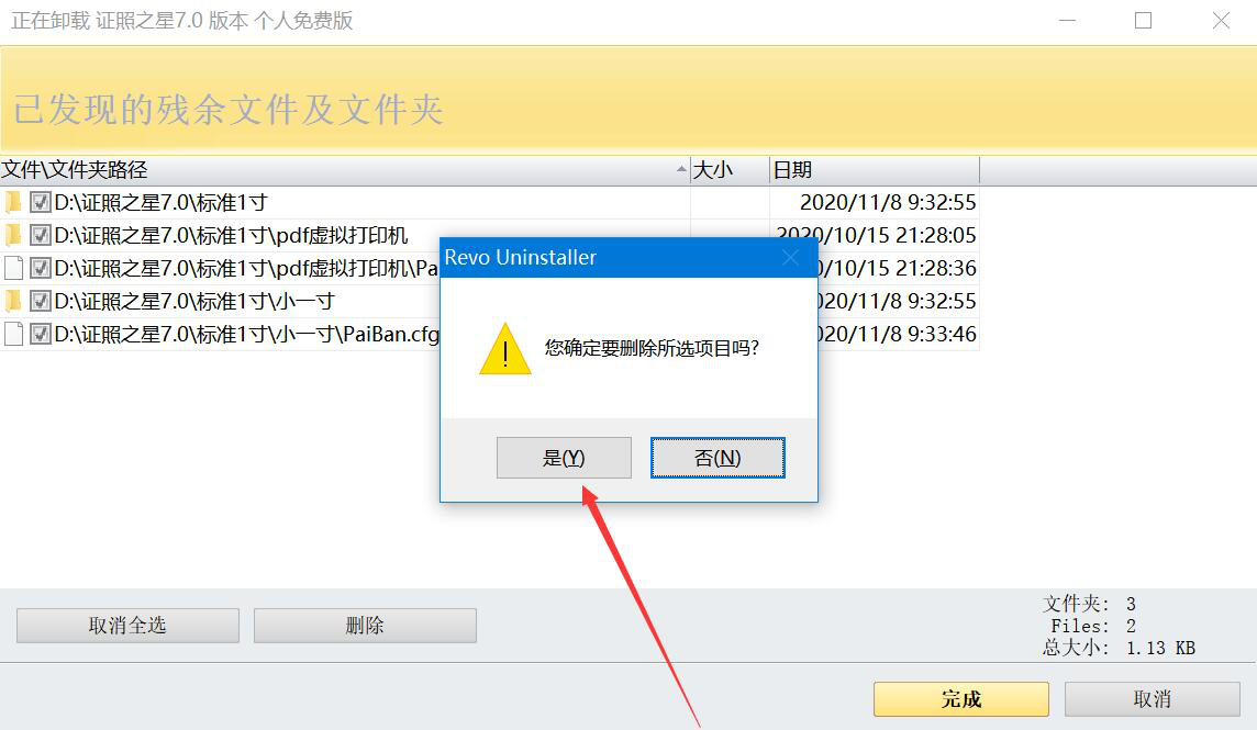 7、最后,在弹出的窗口中,我们点击“是”按钮,Revo Uninstaller便会将所选的残余文件及文件夹一并删除。