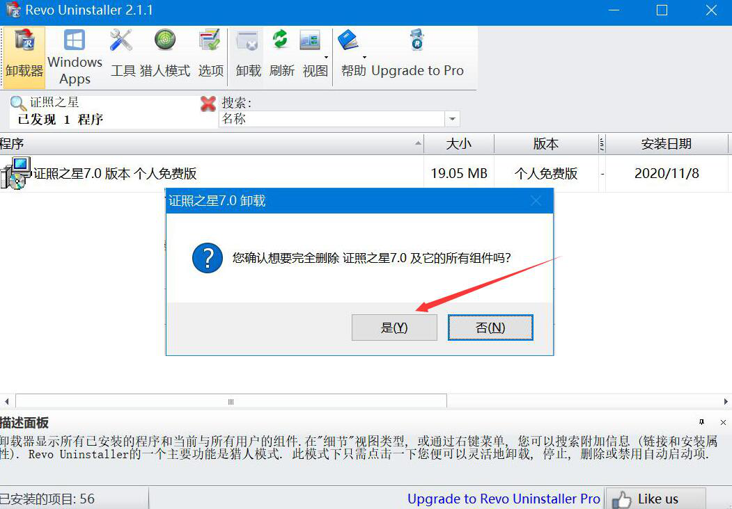 3、此时,Revo Uninstaller会弹出卸载窗口提示,我们点击“是”按钮,确定要将该软件及其组件一并删除。