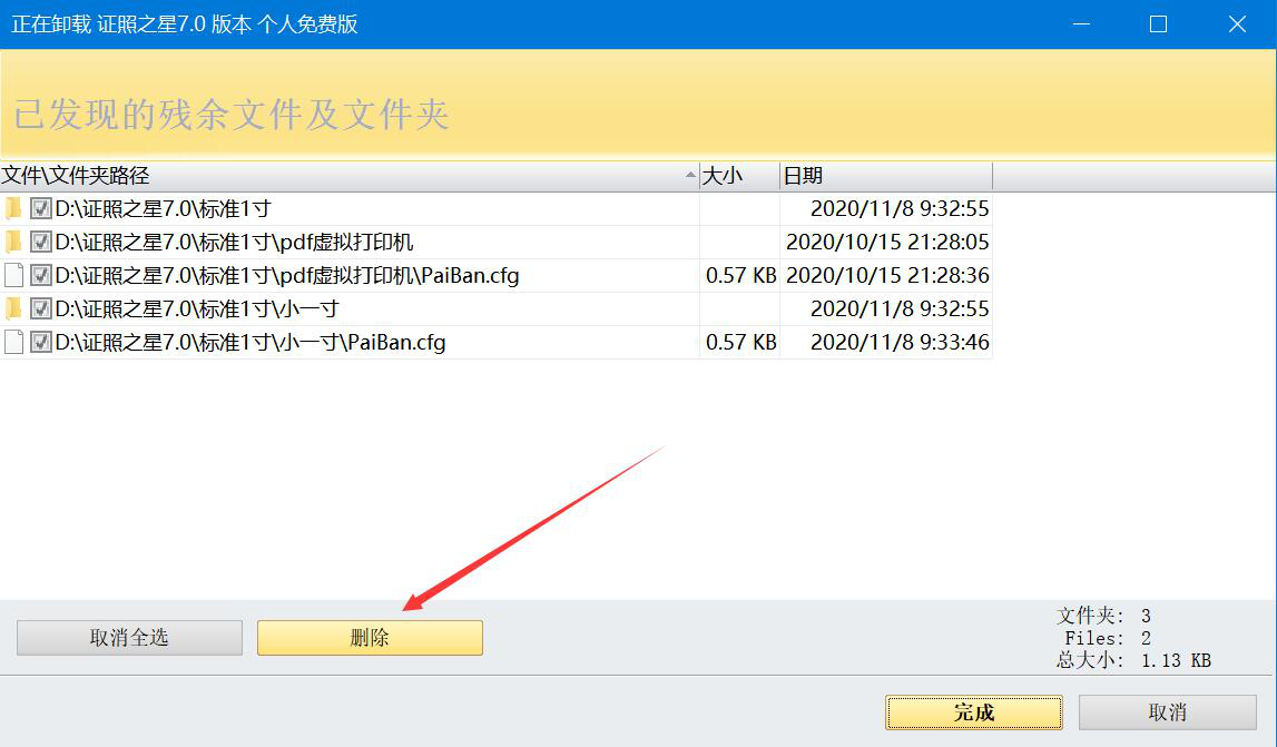 6、扫描完成,我们将需要删除的残余文件及文件夹选中,再点击“删除”按钮。