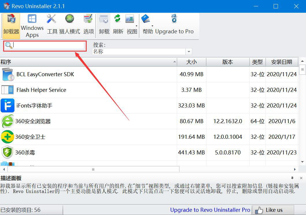 1、首先,我们打开Revo Uninstaller,在操作界面的搜索框中,我们输入想要强制卸载的软件名称。