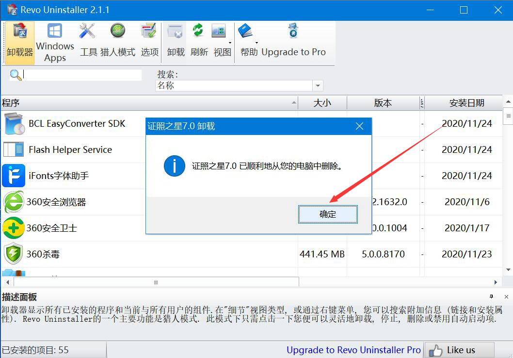 4、当出现如下图的窗口提示,则说明Revo Uninstaller将该软件强制卸载了,我们点击“确定”按钮。