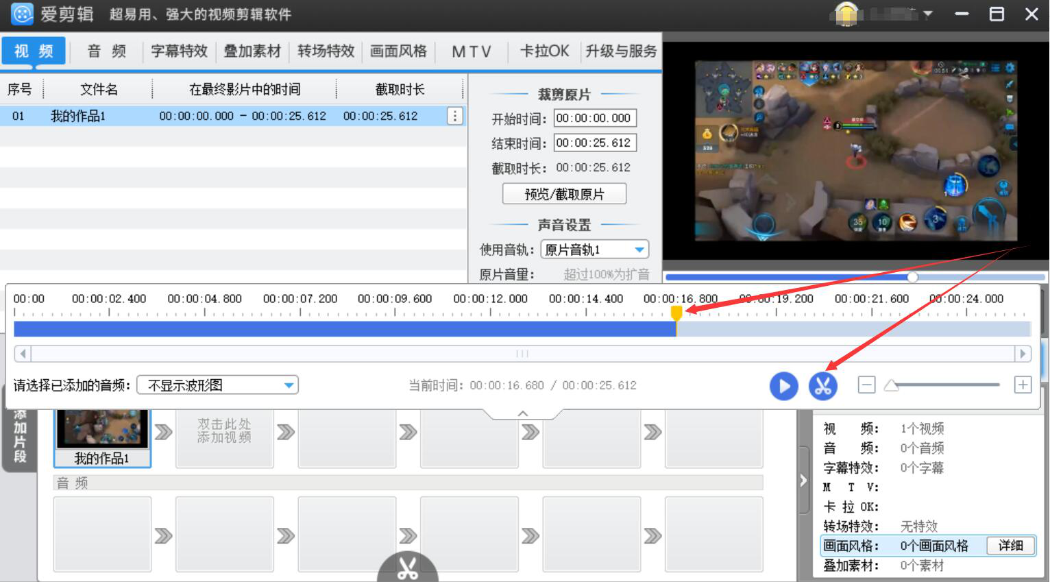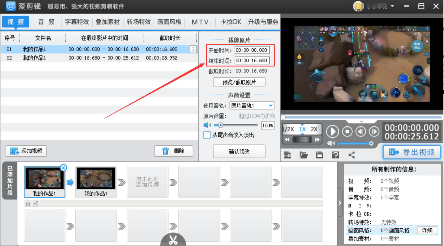 5、此外,想修改已添加视频的时长参数,我们还可以直接在爱剪辑界面中部的“裁剪原片”中,直接输入开始时间和结束时间。