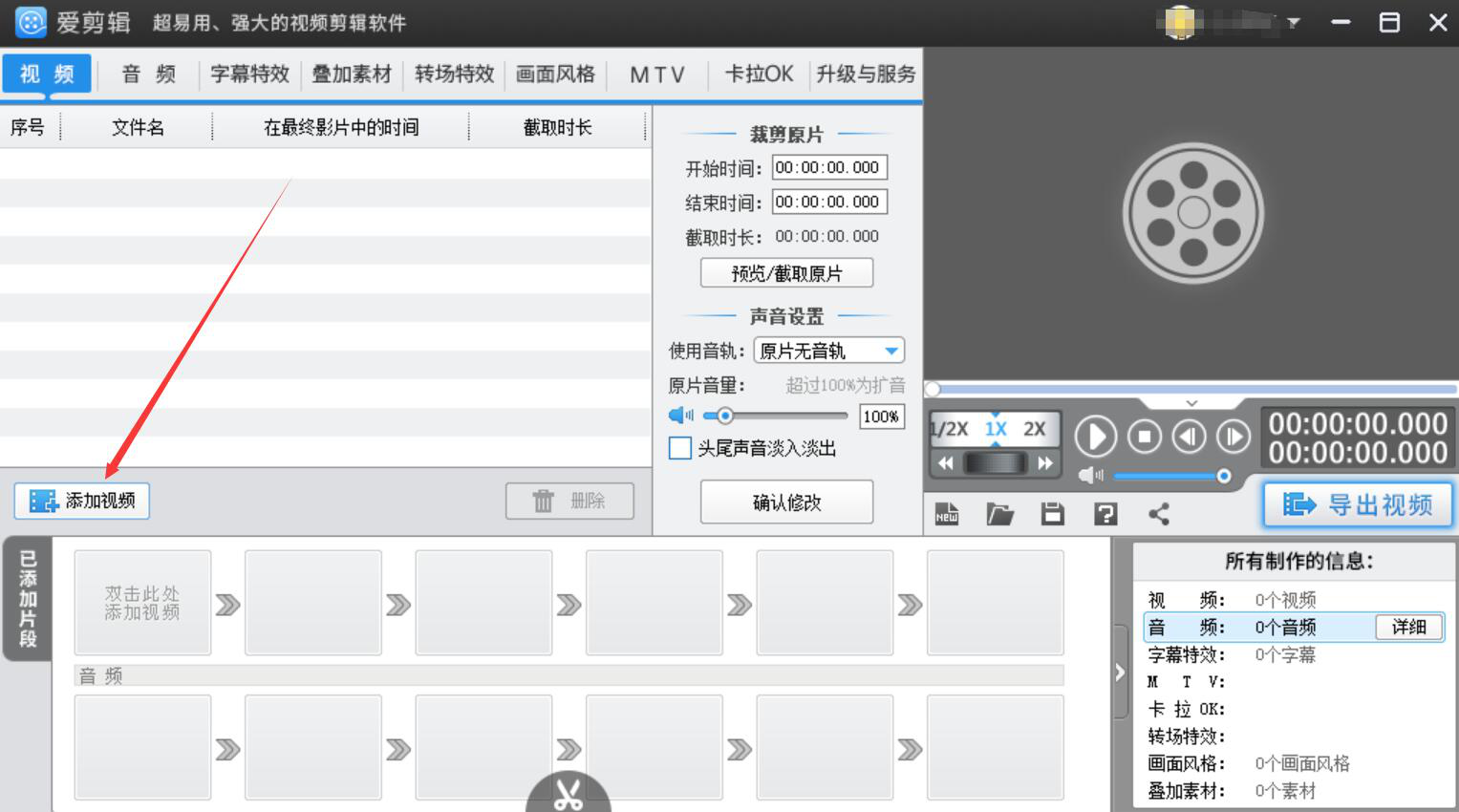 1、首先,我们打开爱剪辑,点击界面左侧的“添加视频”按钮。