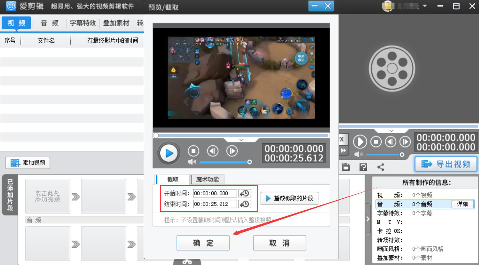 3、然后,我们开始讲解爱剪辑修改已添加视频的时长参数的第一种方法。在爱剪辑弹出来的预览/截取窗口中设置开始时间和结束时间,再点击“确定”按钮。