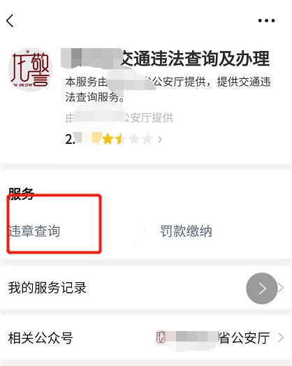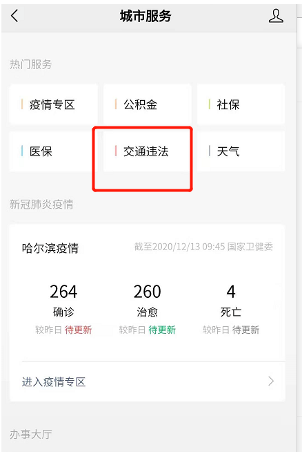 进入城市服务窗口,点击【热门服务】,选择【交通违法】,然后打开公众号,点击【违章查询】功能,