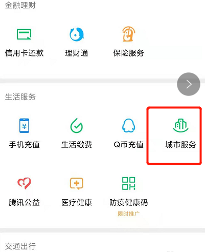 打开支付功能,如图,点击【生活服务】——【城市服务】选项,