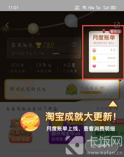 4、进入我的成就页面之后,点击右上角的【月度账单】进入查看消费明细、淘宝人生账单;