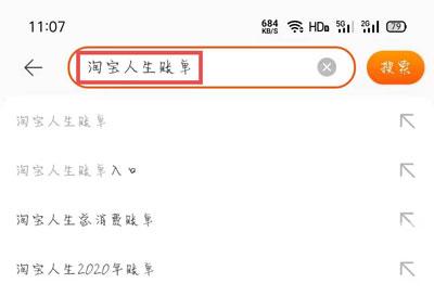 1、打开手机淘宝app,在首页点击上方的【搜索】,输入【淘宝人生账单】,点击【搜索】即可进入,注意不要有空格哦;