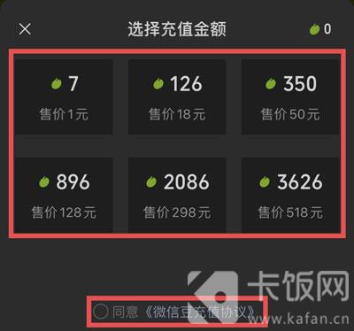 5.在弹出的选择充值金额窗口中,选择需要充值购买的微信豆数量,勾选下方的【同意……】;