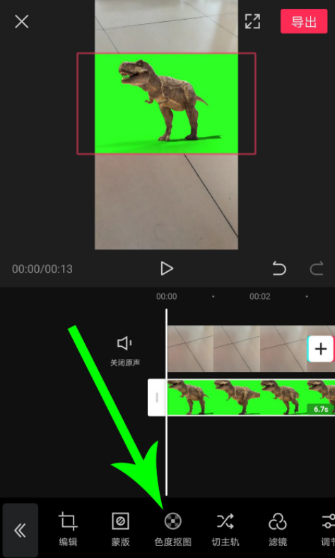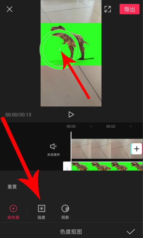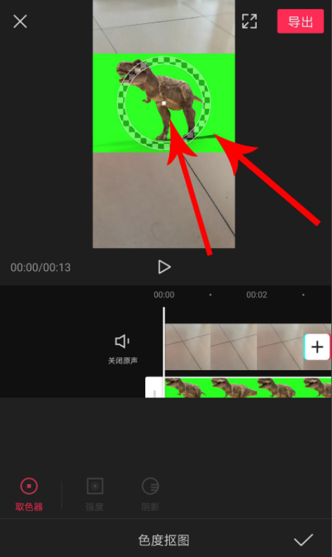 点击“色度抠图”工具,选择“拾色器”,然后将拾色器中心圆点位置拖放至绿幕,注意,绿幕视频中不仅有霸王龙,还有霸王龙的阴影,