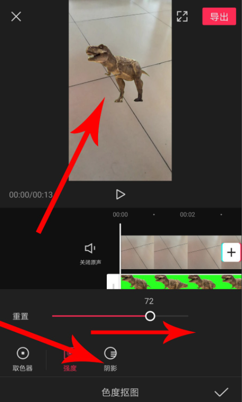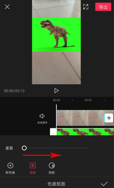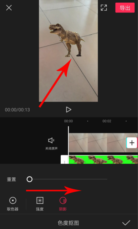 如图,向右拖动滑块,增加去除绿幕的强度,直至绿幕完全从画面消失,画面中就只剩下霸王龙,然后点击“阴影”,