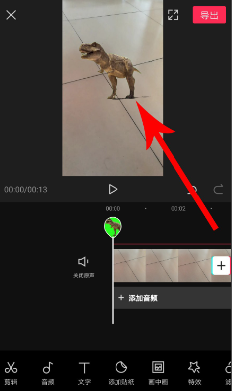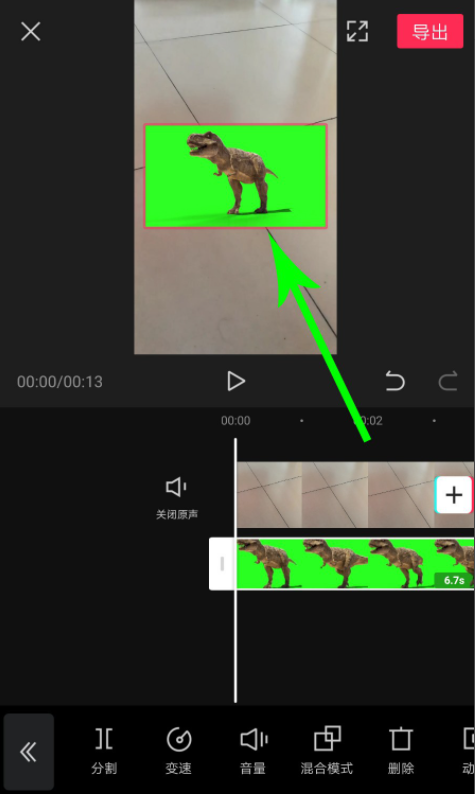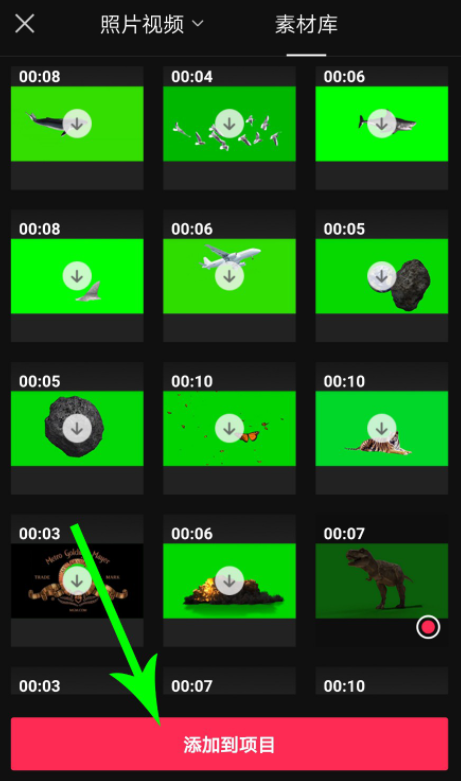 跳转至以下界面,点击“素材库”,向上滑动,选择一个素材,如图,打开绿幕板块,勾选霸王龙绿幕素材,点击“添加到项目”,