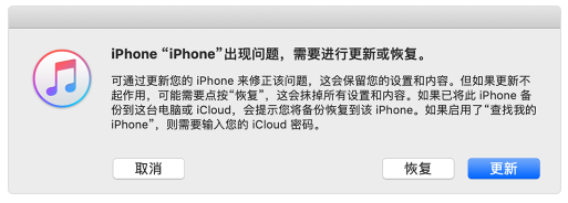 当您看到恢复或更新选项时,选择"更新",iTunes 将尝试重新安装 iOS,但不会抹掉您的数据。
