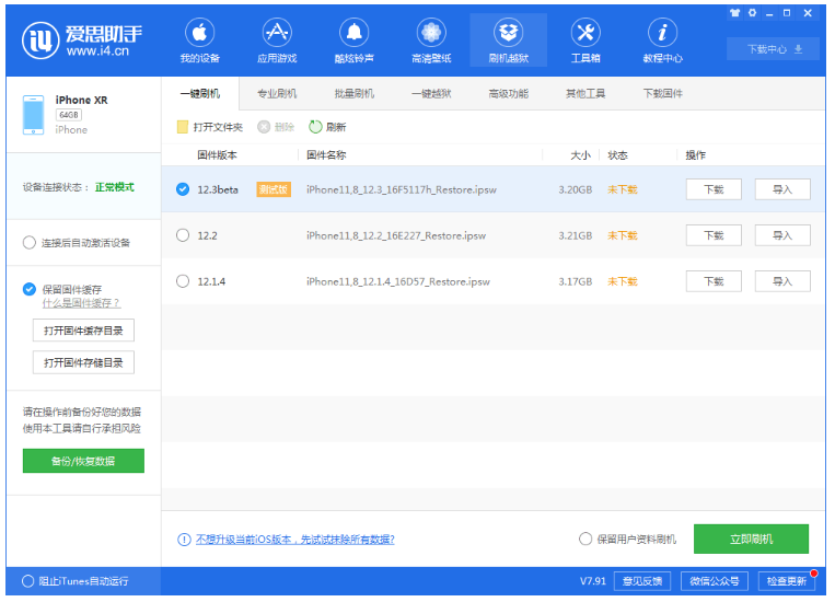设备连接电脑并成功进入恢复模式之后,打开"一键刷机"界面,勾选所需要的固件版本,同时勾选"保留用户资料刷机",点击"立即刷机"即可。