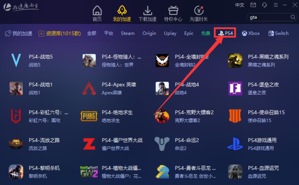 2. 然后,用户根据自己的需要选择相应的 PS4 游戏,在该游戏的界面下方点击"开始加速"的按钮。