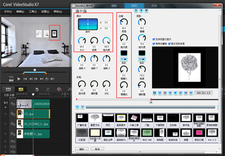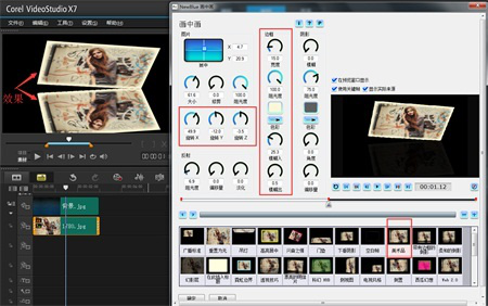 2. 而后点击“滤镜按钮”,将“画中画滤镜”拖动到需要的素材上,在“属性栏”中设置“自定义滤镜”,在弹出的对话框中,首先设置图片的位置. 大小. 边框宽度. 阻光度. 将其设置为自己喜欢的样式,设置如下,如果不会自定义滤镜的可以参考:“会声会影x8“ 自定义滤镜设置。
