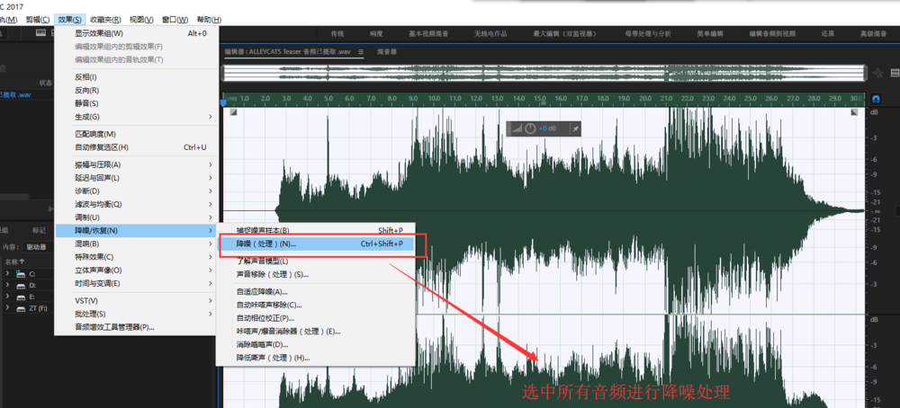 然后选中整个音频,执行“效果“菜单中的“降噪/恢复“——“降噪处理“命令,