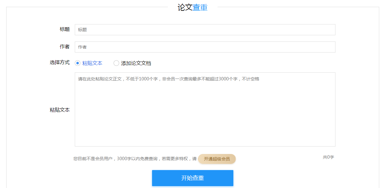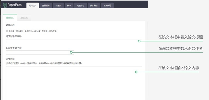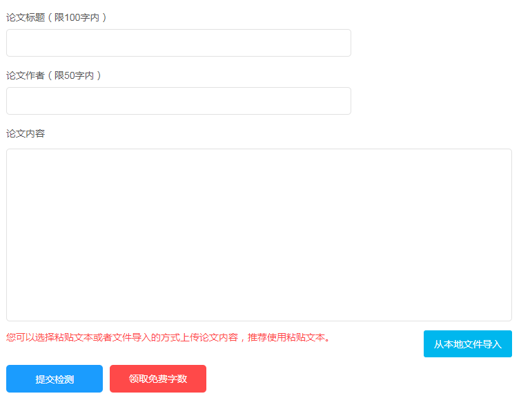 完成注册,登录账号,进入检测中心,如图,输入论文标题和论文作者,然后上传论文,你可以点击“从本地文件导入”,也可以直接复制粘贴文本内容,