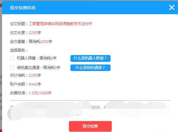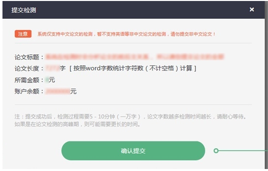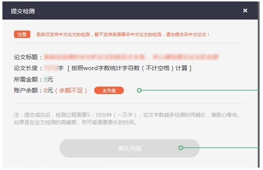 点击提交检测,进入以下界面,如图,需要充值付费,然后点击“确认提交”,