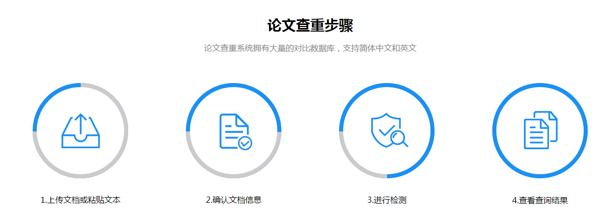 页面显示了论文查重步骤,先要上传文档或者粘贴文本,确认信息,然后进行检测,耐心等待,即可查询结果,